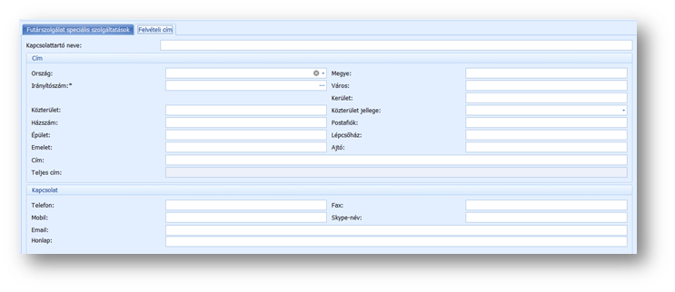Amennyiben a felvételi cím adatot elszeretnénk téríteni a cég adatainknál megadott, vagy a telephely adatoknál megadott cím adattól, így az ide beírt cím adat lesz az adott bizonylatra beválasztott futárszolgálat típusa szerinti felvételi cím. Itt megadható egy kapcsolattartó elem is, amennyiben szükséges. Ha a lapfülön nem töltünk adatot, úgy a rendszer a cég adatok alapján, vagy a cég telephely adatnak megfelelően képzi a felvételi címet.