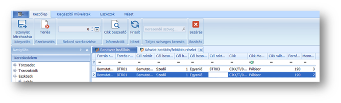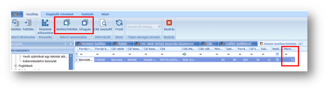 A funkciót elindítva, az áttekintőn megjelennek azok a tételek és kapcsolódó adataik, melyek megfelelnek a beállított paramétereknek, és készlet betöltés szükséges. A mennyiség oszlopában jeleníti meg a program a betölteni kívánt mennyiséget. A tételsorokat duplaklikkel megnyitva módosíthatunk a mennyiségen. Akár egy tételsort, akár többet kijelölve, a menüsorban található Kihagyás funkcióval tudjuk az ajánlást mellőzni, vagy a Betöltés/Feltöltés funkcióval újra visszakapcsolni.