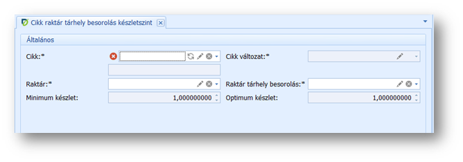 Itt vihető fel a cikkek minimum és optimum készletszintje raktár és raktár tárhely besorolás szerint. Ez az összerendelés biztosítja, hogy cikk/raktár/besorolás szinten meghatározható legyen, hogy mely készletszint alatt jelezzen a rendszer (minimum mennyiség), és milyen célmennyiségig próbálja feltölteni a készletet (optimum mennyiség).