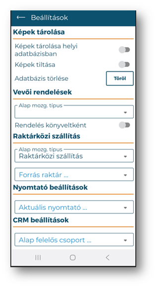 | Forrás raktár: | Beállítható, hogy a mobil rögzített raktárközi szállítólevélnek mely raktár legyen az alapértelmezett raktár értéke. |