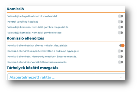 | Komissió ellenőrzés. Vonalkód beolvasásra mentés: | Bekapcsolása esetén a komissió ellenőrzés során a sikeres vonalkód beolvasáskor egyből mentésre is kerül a tétel. |