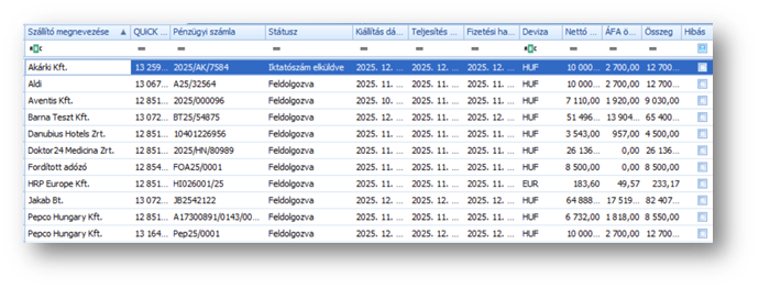 Itt követhető nyomon az importált költség számlák feldolgozásának menete, a feldolgozás során keletkezett hibák. Amennyiben egy számla tévesen került átvételre, akkor lehetőség van kihagyott státuszra állítani a Csoportos állapot változtatás funkciógomb használatával