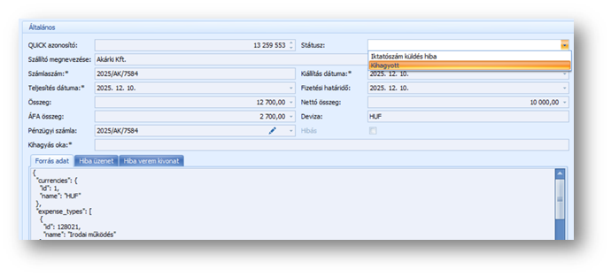 Forrás adat frissítése funkciógomb: ha az átvett költségtranzakcióban hiba van, tehát Hiba státusszal jelenik meg a listában a tétel, akkor a QUiCK felületen elvégzett módosítás után, ennek a gombnak a használatával a lekérdezett tétel frissíthető, majd a következő feldolgozáskor elkészül a pénzügyi számla. Figyelem: a Hiba státusz nem fog megváltozni akkor sem, ha a költségszámla már javítva lett a QUiCK felületen és a Forrás adat frissítés gombra is rányomtunk. A feldolgozás a Hiba státuszúakra is fut és ha nincs további hiba, feldolgozza a tételt.