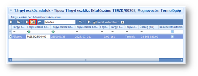 3) Az áttekintőn található beruházási tranzakció sorokból duplaklikkel vagy Ok-val válasszuk ki azt, amely az adott tárgyi eszköz beszerzéshez kapcsolódik. Az áttekintőn megjelenik a választott tranzakció. Ezt kijelölve, nyomjunk a Szerkesztés funkció gombra.