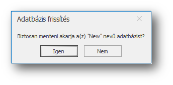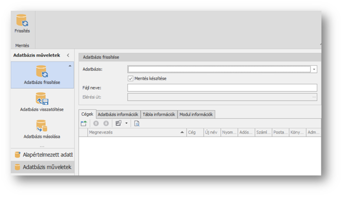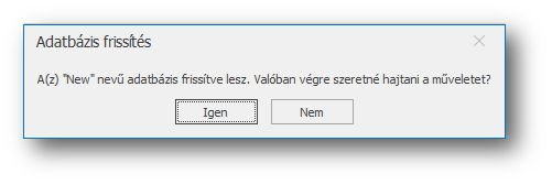 A jobb oldali „Adatbázis frissítése” területen az Adatbázis mezőben válasszuk ki a frissítendő adatbázist. A mentés készítése (I/N) beállítással szabályozhatjuk, hogy frissítés előtt készítsünk-e mentést, ami feltétlenül ajánlott!