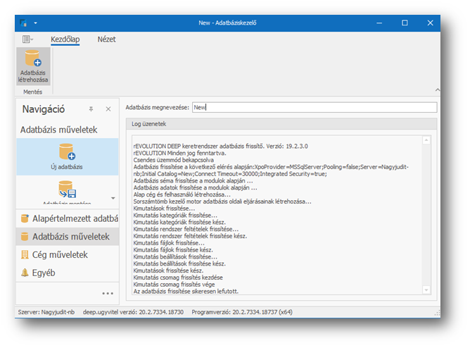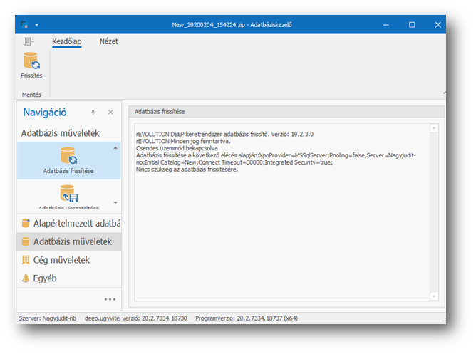 Ezt követően az ugyvitel.dbmanager jobb oldali területén megjelenik a frissítés részletes naplózása, hogy mi történt.