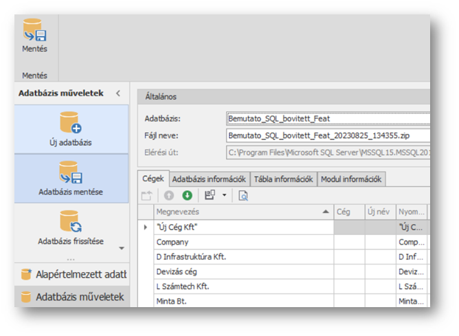 Mindkét mezőnek kezdőértéket ad az Egyéb / Beállítások menüpontban az Alapértelmezett mentési hely területen megadott útvonal és mentés pipa. Amennyiben bepipáltuk, hogy készüljön mentés, akkor alatta PostgreSQL használata esetén az Elérési út mezőben tallózzuk ki, hogy hová, milyen néven mentsük el az adatbázist. (*.zip) MSSQL használata esetén az MSSQL alapértelmezett backup könyvtárába történik a mentés, amit nem lehet módosítani. Ilyenkor a fájl neve mezőben tudjuk megadni, hogy milyen néven mentjük az adatbázist.