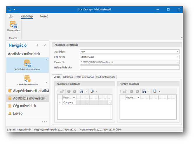 Ezzel megtörtént a korábbi mentés alapján az adatok visszatöltése a kiválasztott adatbázisba.