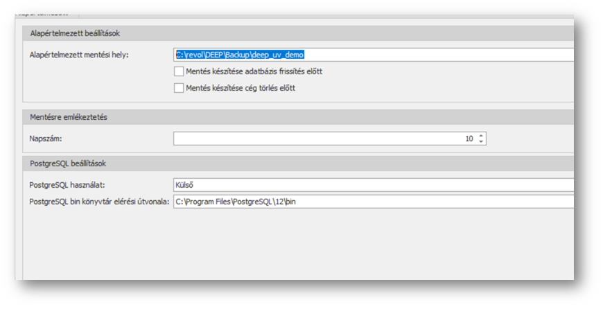 Az Alapértelmezett területen az "Alapértelmezett mentési hely" mezőben kitallózott könyvtárt fogja az ugyvitel.dbmanager felajánlani adatbázis mentéskor alapértelmezett könyvtárként Postgre SQL esetében (MSSQL esetben csak az MSSQL saját könyvtárába történhet a mentés. Pl: C:\Program Files\ Microsoft SQL Server\MSSQL.13.SQLEXPRESS\MSSQL\Backup\adatbazisnev_datum_ido.zip). Az alatta lévő Mentés készítése adatbázis frissítése előtt (I/N) mezőt bepipálva pedig a mentés mezőnek tudunk kezdőértéket adni. MSSQL esetén csak akkor használható a beállítás, ha az alapértelmezett mentési hely az MSSQL géppel azonos gépen található (és joga van ide is írni az MSSQL szervernek.) A módosításokat a toolbar Mentés gombjával rögzíthetjük, vagy a Mégsem gombbal elvethetjük.
