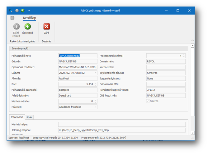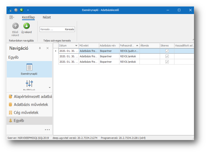A megjelenő táblázatban láthatóak az ugyvitel.dbmanagerrel korábban elvégzett műveletek, azok időpontja, a műveletet végző felhasználók, a vonatkozó adatbázisok, a művelet sikeressége. A táblázat soron történő duplaklikkelésre pedig a sorbeli műveletre vonatkozóan további tájékoztató adatok jelennek meg.