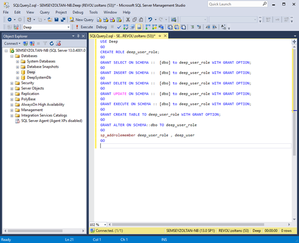 sp_addrolemember deep_user_role , deep_user -- A szerepkörhöz az adatbázis felhasználó hozzáadása