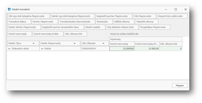 | Terv érték: | Szállítólevél sorok alapján számított terv, hogy mennyi lesz a sor készletértéke. |
