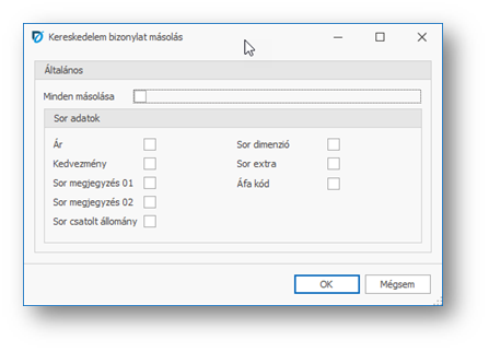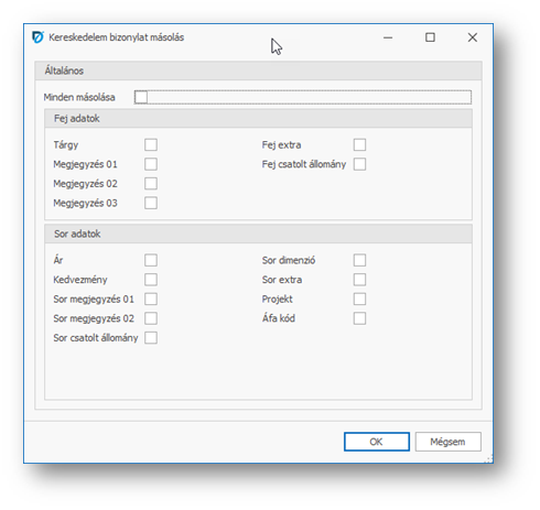 | A választás után megjelenő ablakban megadhatjuk, hogy a kiválasztott bizonylat(ok)ból mit szeretnénk átmásolni. Amennyiben több bizonylatot jelölünk ki másolásra, akkor a fej adatok (tárgy, megjegyzések, fej extra, és fej csatolmány) nem másolhatók. A Minden kiválaszt kapcsolóval nem kell egyesével kijölnünk az összes választáshoz a mezőket. |