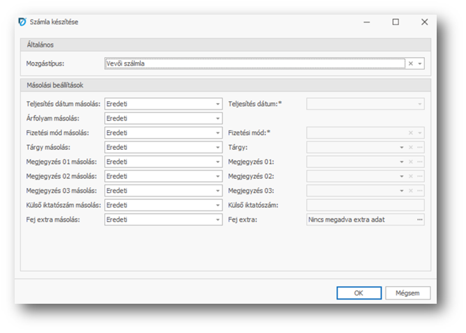 | Fej extra másolás: | Eredeti / Alapértelmezett / Egyedi, választással meghatározhatjuk, hogy honnan nyerje a mező az értékét a generált bizonylatban. |