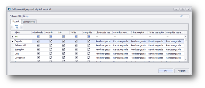 A művelet elindítására a megjelenő ablakban az aktuális felhasználó típusonkénti jogosultsági adatai tekinthetők meg.