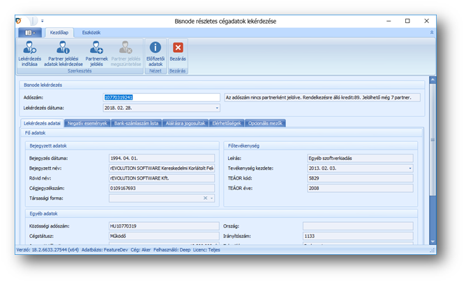 | Dun&Bradstreet műveletek / Részletes cégadatok lekérdezése: | A részletes cégadatok lekérdezésével lényegesen több adathoz férünk hozzá, mint az alapadatos verzióval. Ez nem ingyenes funkció, rendelkeznünk kell Dun&Bradstreet előfizetéssel, és a lekérdezés fogyasztja a kreditjeinket. A Cég funkcióban "Teszt" cégtípus beállítása esetén a "Részletes cégadatok lekérdezése" művelet nem aktív. (Így a "Partnernek jelölés", a "Partner jelölés megszüntetése" és a Partneri jelölési adatok lekérdezése is tiltott.)) A művelet megjelenik az Áttekintő menüsorban is. Dun&Bradstreet beállítás-ok. |