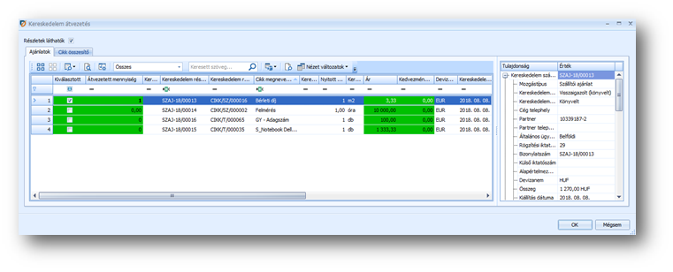| Átvezetés: | Amely funkcióban van lehetőség előzmény bizonylat tételei alapján egy új, másik típusú bizonylat kiállítására, ott jelenik meg. Ezek a kereskedelmi tranzakciók: Szállítói rendelés, Szállítói szállítólevél, Szállítói számla, Vevői rendelés, Vevői szállítólevél, Vevői számla, Raktárközi szállítás, Belső szállítólevélnél a ki irányú mozgások, pl: Belső felhasználás, Egyéb kiadás, ... . Átvezetés esetén, a cél bizonylaton ha módosítjuk a devizanemet, akkor az átvezető felületen a cél bizonylat szerinti devizának megfelelő értékek jelennek meg. A megjelenő ablakban a "Kiválasztott" oszlop értékét "Igaz"-ra váltva tudjuk jelezni, hogy átemelendő a sor. A sorbeli "Átvezetett mennyiség" mezőben a nyitott mennyiségtől eltérő mennyiséget is beírhatunk, azaz kevesebbet, vagy többet is átvezethetünk. Az átvezető ablakban lehetőségünk van az Ár és a Kedvezmény módosítására is. A "Részletek láthatók" beállítással megjelenő jobb oldali terület a kiválasztott sorra vonatkozó bizonylati adatokat tartalmazza a választás megkönnyítésére. Az ablak leokézásával bekerülnek a bepipált sorok a szerkesztett bizonylat soraiba. A "Nyitott mennyiség" oszlopban látható mennyiség attól függ, hogy ugyan abban a bizonylatban végezzük-e az átvezetést, mint, amelybe már átvezettünk jelen forrás sorból. Amennyiben igen, akkor a forrás bizonylatsor, az eredeti, átvezetés nélküli nyitott mennyiségét tartalmazza és az Átvezetett mennyiségnél jelenik meg a cél bizonylaton szereplő mennyiség. Például 3 db-os rendelés tételből átvezetve szállítólevélre 2 db-ot, majd ismételt műveletindításkor ugyan abban a bizonylatban 3-at fog mutatni a nyitott mennyiség, hiszen ennyit kell a rendelésről összességében átvezetni, ha ezen a bizonylaton vezetjük át az egészet. Viszont, ha már véglegesen rögzítettük (elkönyveltük) a 2 db átvezetést tartalmazó szállítólevelet és másik szállítólevelet nyitva indítjuk el az átvezetést, akkor 1 db-ot fog mutatni, hiszen már 2-t átvezettünk másik szállítólevélre. |