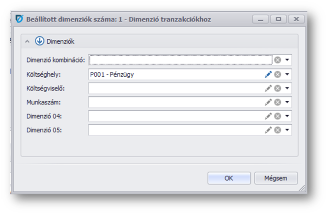 | Dimenzió sor szerkesztése: | akár rögzítés alatt, akár könyvelt a bizonylatunk könyvelési státusza, a dimenzió sor adatokat megadhatjuk/szerkeszthetjük a megjelenő segédablakban. Tranzakciós bevitelekben jelenhet meg a művelet. Dimenzió és extra adatok leírása a linkről olvasható. |