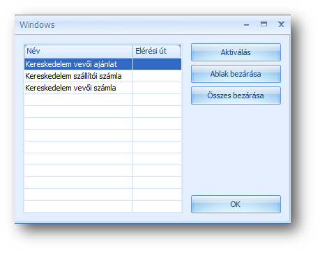| Windows: | A táblázatban megjelenő nyitott funkcióablakokat tudjuk az Ablak bezárása nyomógombbal bezárni, az Aktiválás nyomógombbal pedig rápozícionálni a fókuszt., vagy egyszerre az összeset bezárni az Összes bezárása nyomógombbal. |