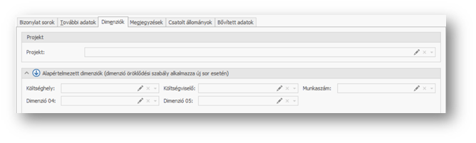 Általában a tranzakciók fej és sor lapfüleivel egy szinten jelenik meg a "Dimenziók" lapfül, amelyen a bizonylat egészéhez kapcsolódóan tudunk sor dimenziókat beállítani, valamint a bizonylat soroknak tudunk a sor dimenzió területen kezdőértéket adni.