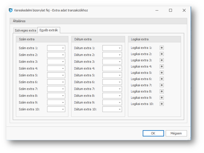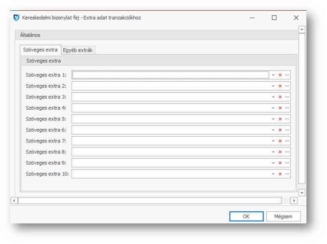 | Fej extra: | A mező melletti …-ra kattintva extra adatokat vehetünk fel a tranzakcióhoz, vagy ha már vettünk fel, akkor megnézhetjük azok értékét. A megjelenő ablakban a Szöveges extra lapfülön 10 darab szöveges adatot, míg az Egyéb extrák lapfülön Szám, Dátum és Logikai típusú adatokból rögzíthetünk 10-10-et. Ha vettünk fel extra adatokat, akkor a mezőben azt látjuk kiírva, hogy a 4 extra típusból típusonként hányat rögzítettünk. A Szöveges extra mezőkbe a Bizonylati megjegyzés funkcióba felvett megjegyzésekből (fej, sor) is választhatunk. Az extra adat mezőket az Extra adat beállítás funkcióban egyedi címkékkel ruházhatjuk fel, maszkolhatjuk és ellenőrzési szabályokat definiálhatunk rájuk. |