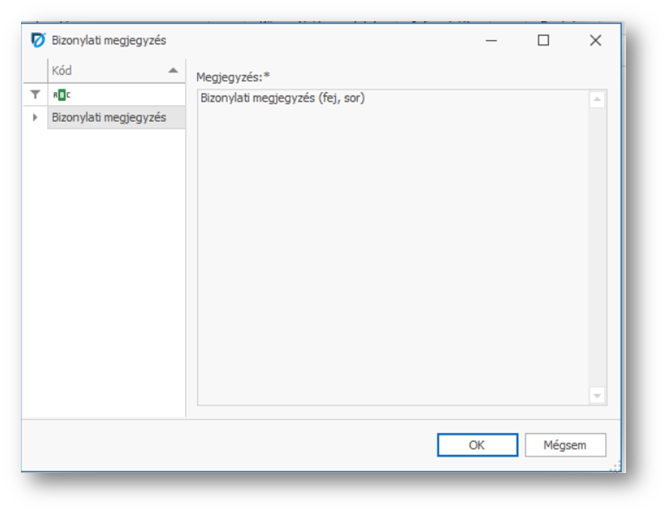 A Megjegyzés 01..03 mező melletti ... gombra kattintva megjelenik az alábbi, az előre definiált megjegyzések kiválasztására szolgáló ablak, ahol a Bizonylati megjegyzés funkcióba előzetesen felvett megjegyzések közül választhatunk.
