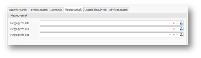| Megjegyzés 01: | A tranzakcióhoz fűzött egyes számú megjegyzés. Szabad szövegesen is beírhatunk megjegyzést, de a … gombra kattintva választhatunk a Bizonylati megjegyzés funkcióban előre rögzített (fej)megjegyzések közül is. A kiválasztott előre definiált megjegyzés a kézzel már megadott megjegyzéshez kerül hozzáfűzésre. A mező melletti legördítő nyilacskára kattintva megtekinthetjük az összefűzött megjegyzést. |