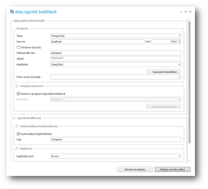 A deep.ügyvitel PostgreSQL és MSSQL adatbázis kezelőt is tud használni. Beüzemeléskor döntsük el, hogy az ingyenes PostgreSQL-t, vagy a nagyobb, ingyenes (MSSQLExpress) vagy a fizetős MSSQL-t választjuk-e. A deep.ugyvitel ajánlása az MSSQL. Ennek eldöntése után telepítsük fel az adatbázis kezelő programot az adatbázisszerver gépre. Egyik adatbázis kezelőből a másikba való adatbázis visszaállításra nincs lehetőség, így ez fontos döntés.