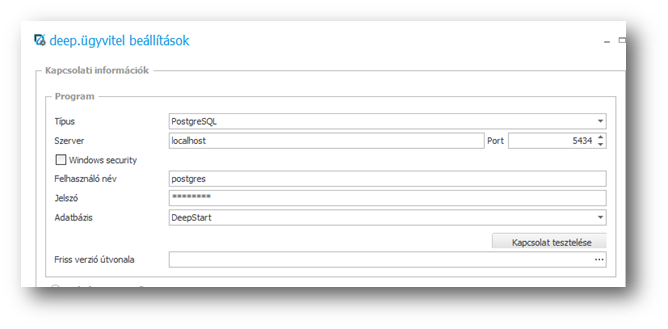 Másrészt a helyi gépre fel kell telepíteni a deep programot, amelynek a deep.configuration.exe programjában meg kell adni a távoli adatbázis szerver típust, a szervet ip címét (saját hálózaton belül a szerver gép nevét), a portot, amin kommunikál a szerver. Ezt a portot a szerver tűzfalán is ki kell engedni! Az adatbázis ilyenkor nem biztos, hogy kiválasztható, hanem be kell írni kézzel karakterhelyesen a nevét.