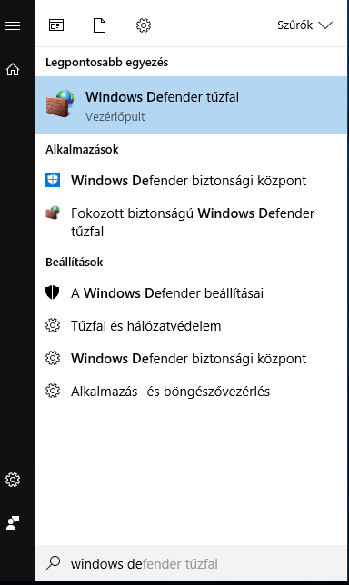 Indítsuk el a Start menüből a Windows Defender tűzfal programot.