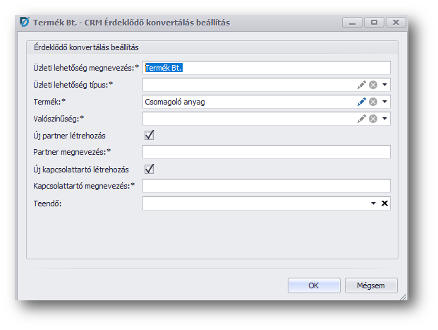 Itt már a program előtölti azokat az adatokat, amiket tudott, az érdeklődő alapján. A CRM modul ellenőrzi a Partner megnevezése alapján a partnerek között, hogy létezik-e az ügyfél. Ha talál egyezést, akkor a program felajánlja ezt a partnert, ha nem, akkor bejelöli, hogy „Új partner létrehozása”. Ha kivesszük az „Új partner létrehozása” jelölést, akkor választhatunk a partnerek közül.