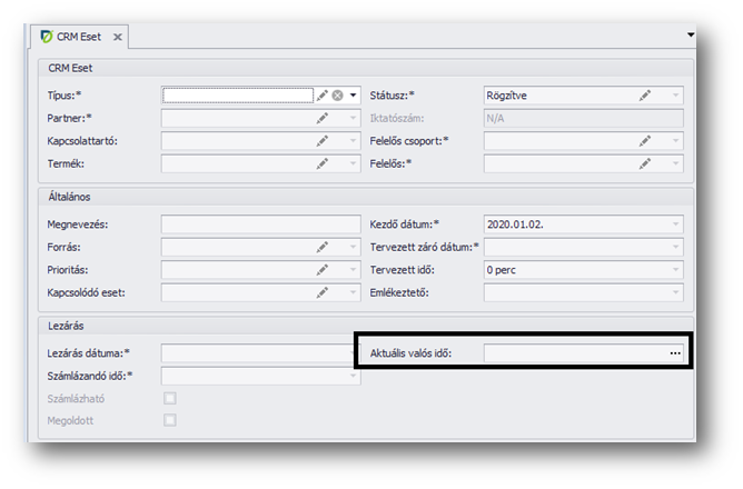 Az eseményben meg tudunk adni kezdés és befejezés időpontot (vagy valós időt), ami az esetnél az „aktuális valós idő” mezőnél fog megjelenni, már akkor is, mikor még nincs lezárva az eset. Ebben a mezőben az esethez tartozó összes esemény valós idejét fogja a program számolni.