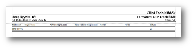 A kimutatással a CRM érdeklődőket tudjuk kinyomtatni egy egyszerű listában.