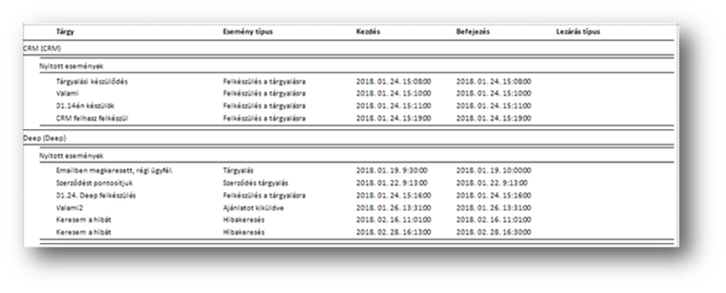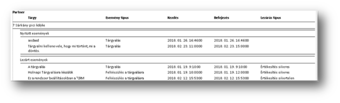 A CRM partnerhez tartozó eseményeket tudjuk listában kinyomtatni, a CRM partnerre csoportosítva: