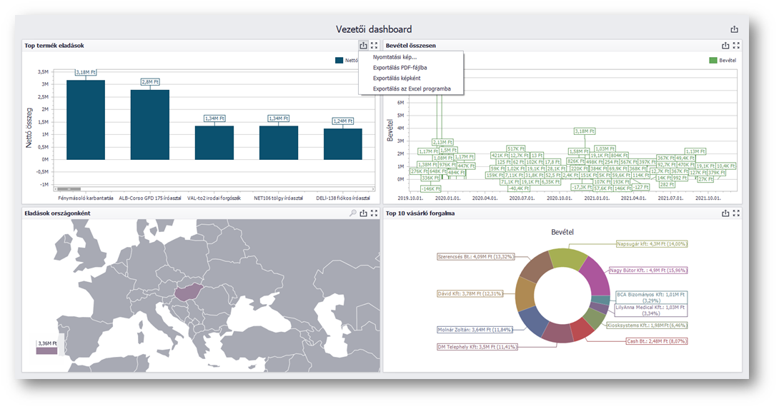 Adott műszerfalra belépve lehetőségünk van annak teljes mentésére a jobb felső sarokban látható funkcióval. Az adott dashboard elemre jobb klikkel szintén készíthetünk export állományt.