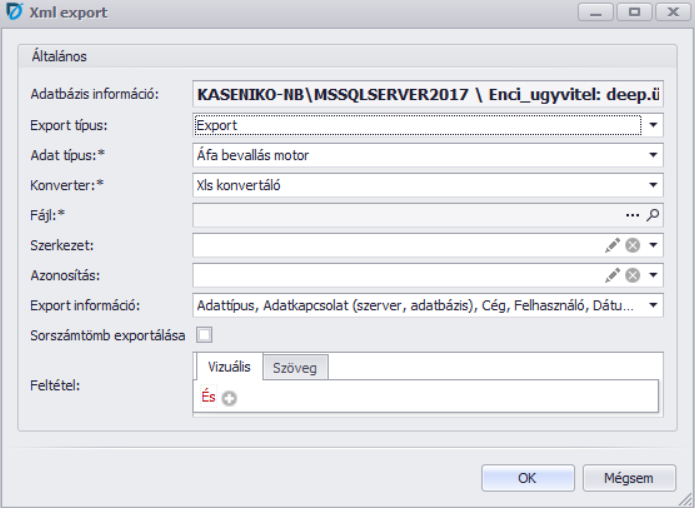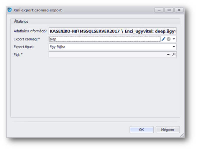| Adatbázis információ: | Nem módosíthatóan kiíródik a mezőben, hogy mely adatbázis, mely cégéből történne az export. |