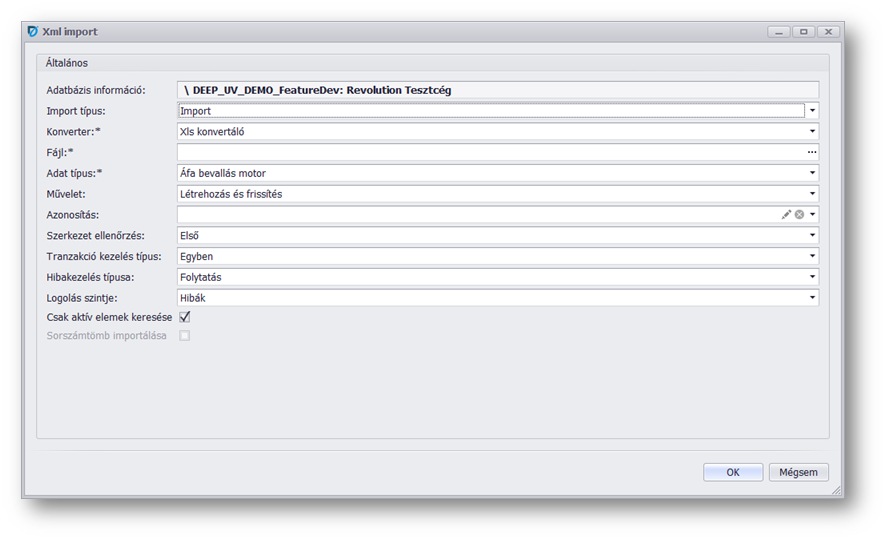 | Adatbázis információ: | Nem módosíthatóan kiíródik a mezőben, hogy mely adatbázis, mely cégébe történne az import. |