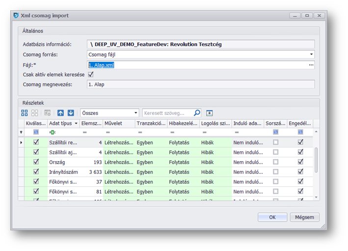 A táblázatban megjelennek a csomagban összeállított beviteli adat típusok, amelyek közül pipálással kiválaszthatjuk, hogy melyeket akarjuk importálni, illetve tájékoztató adatokat is láthatunk, például az elemszámot. Egyenként módosíthatjuk a sorokban a Műveletet (Nincs / Létrehozás / Frissítés / Létrehozás és frissítés), a Tranzakció kezelés típust (Egyben / Elkülönítve), a Hibakezelés típusát (Folytatás / Kilépés / Folytatás hibagyűjtéssel), a Logolás szintjét (Hibák / Nincs / Teljes).