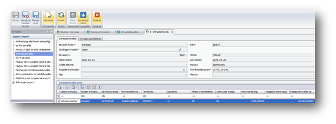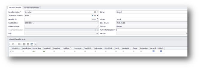 | Bevallási motor: | Előtöltődik az Intrastat bevallási motorral. |