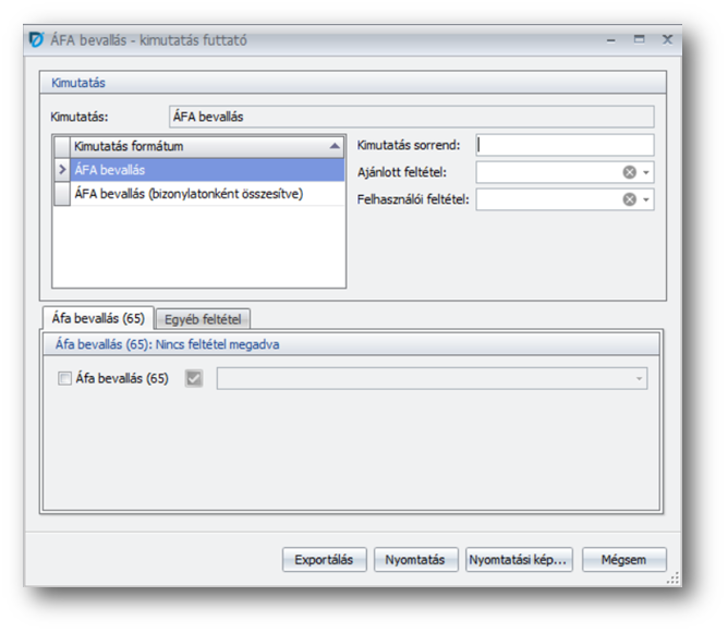 | Kimutatás formátum: | ÁFA bevallás (általános, bizonylatonként összesítve) |