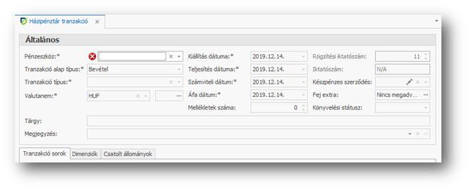| Tranzakció típus: | A pénztári bizonylat típusok közül kell a megfelelőt kiválasztani. |