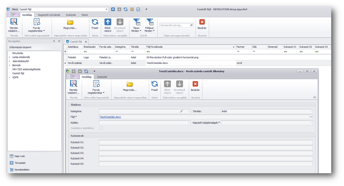 A rendszer számos helyen kínál lehetőséget egy létrehozott bizonylathoz külső dokumentum fájl becsatolására. Ilyen például a szállítói szállítólevélbe belépve a csatolt állományok lapfül. A menüpont lehetővé teszi a csatolt fájlok megjelenítését egy közös listanézetben.