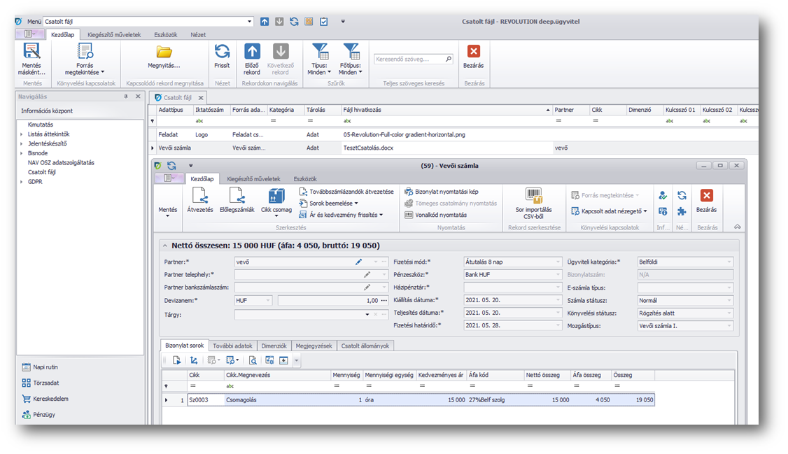 | Kiegészítő forrás megtekintése: | Azt a tranzakciót tekinthetjük meg amihez a csatolt dokumentum kötődik, például vevői számla. |