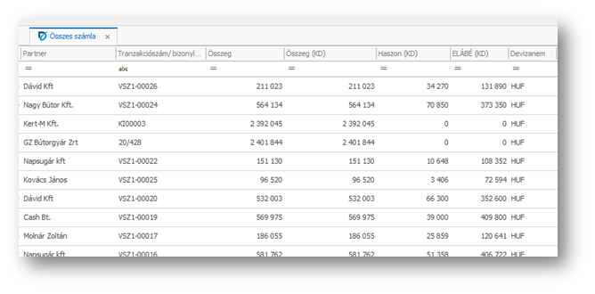 A funkcióban listás áttekintő nézetben jelennek meg a felvett számlák (fej szinten). Ez a Számla (fej) analitika a rendszerben.