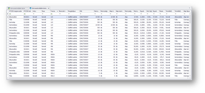Ebben a listás áttekintőben találhatóak azok a tételek, amelyekre vonatkozik a környezetvédelmi termékdíj. Ez a környezetvédelmi termékdíj analitika. A kereskedelmi tranzakciók felvétele (postolása/könyvelése) után kerülnek be az analitika tételek. A sorokon duplaklikkel tudjuk a vonatkozó részleteket megnézni pl: súly, termékdíj összeg, bevallandó/statisztikai, forrás bizonylat adatok, stb.