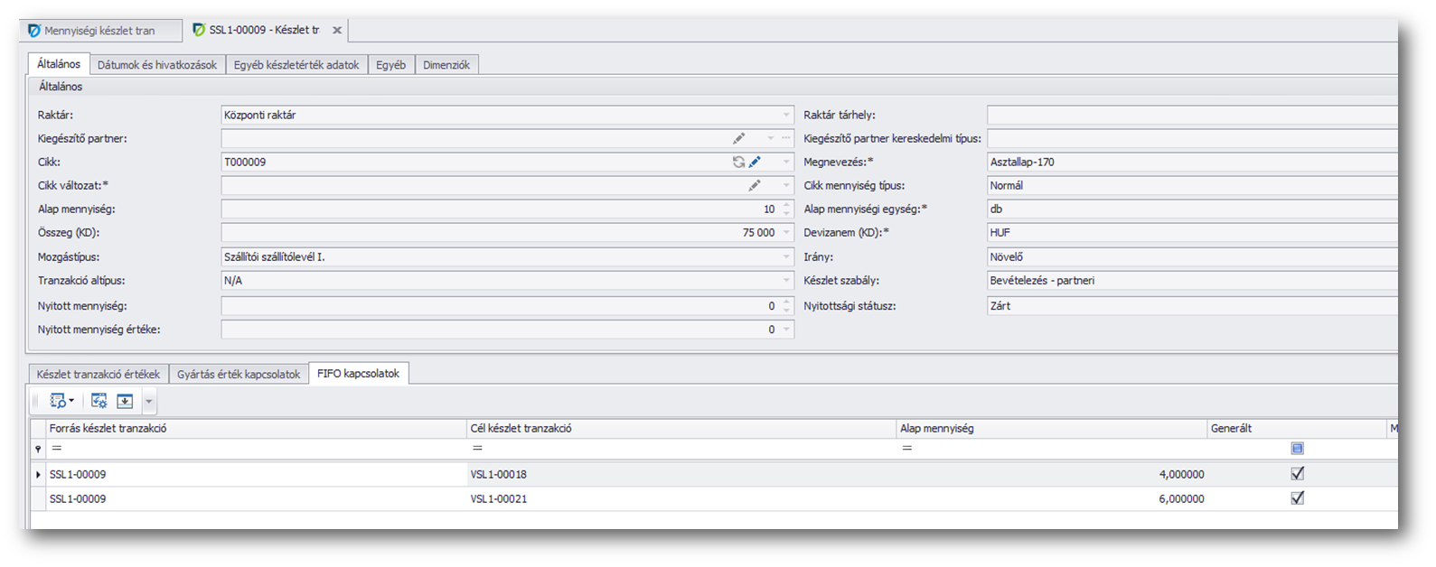 Az alsó területen megjelenik a "Kereskedelmi készlet tranzakciós értékek", "Gyártás érték kapcsolatok", "FIFO kapcsolatok" és az "Adag-/gyári számok" táblázatos alfül is.