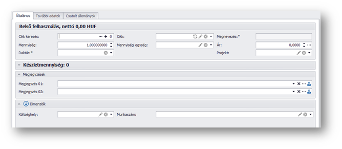 | Cikk: | Cikk választás, amely terméket át kívánunk szállítani. Kötelező mező. (TradeTransactionInternalDeliveryNoteRow.) |
