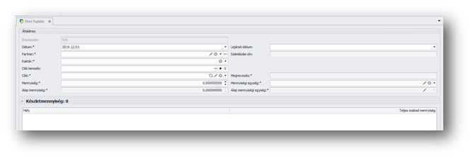 | Raktár: | Raktár választás az aktív raktárak közül, amely raktárból foglaljuk a készletet. Kötelező mező. (Tárhely választás nincs, mert indifferens, hogy a raktáron belül melyik tárhelyen lévő cikket foglaljuk le.) |