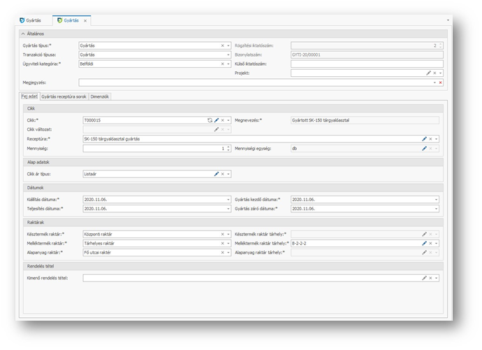 | Rögzítési iktatószám: | A gyártási bizonylat sorszáma, melyet automatikusan oszt a program. |