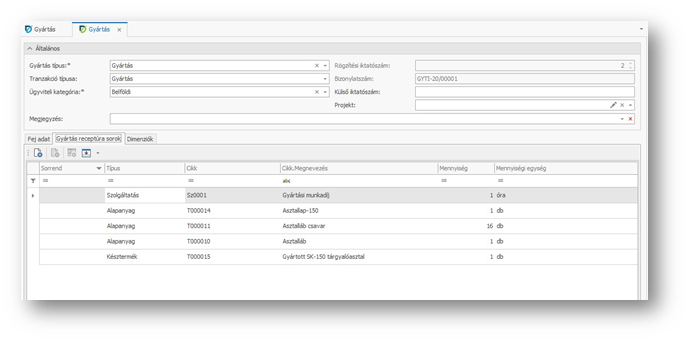 - Gyártás tranzakció receptúra sor adatok megjelenítő és rögzítő felülete -